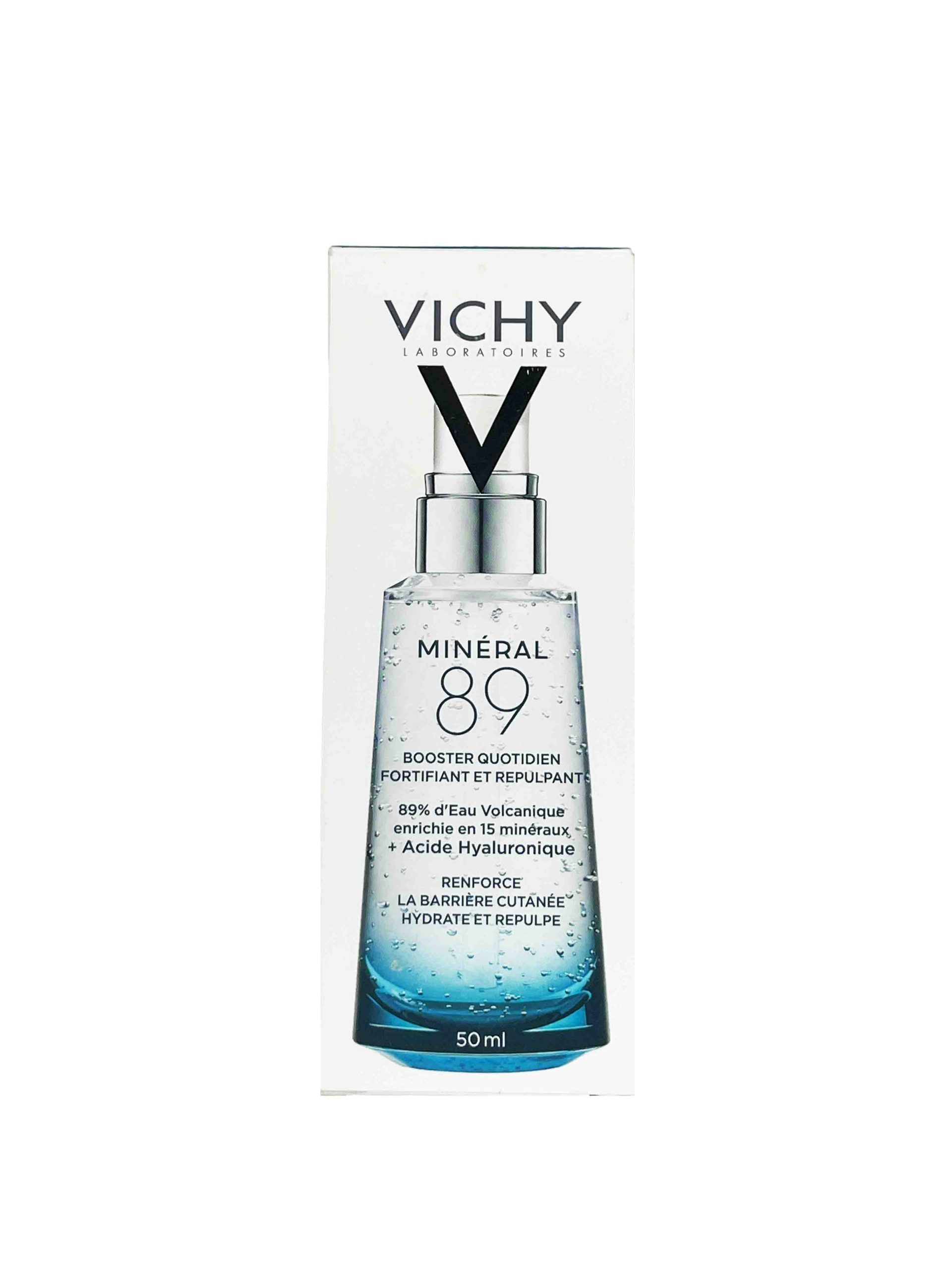 سرم ویشی مینرال ۸۹ بر پایه آب معدنی ویشی فرموله شده که حاوی ۱۵ ماده معدنی کمیاب است و به بازسازی سد محافظتی پوست کمک میکند. اصلیترین ماده فعال این سرم، هیالورونیک اسید با وزن مولکولی پایین است که توانایی نگهداری آب را تا ۱۰۰۰ برابر وزن خودش دارد و به این ترتیب باعث حفظ رطوبت عمیق در لایههای پوست میشود.